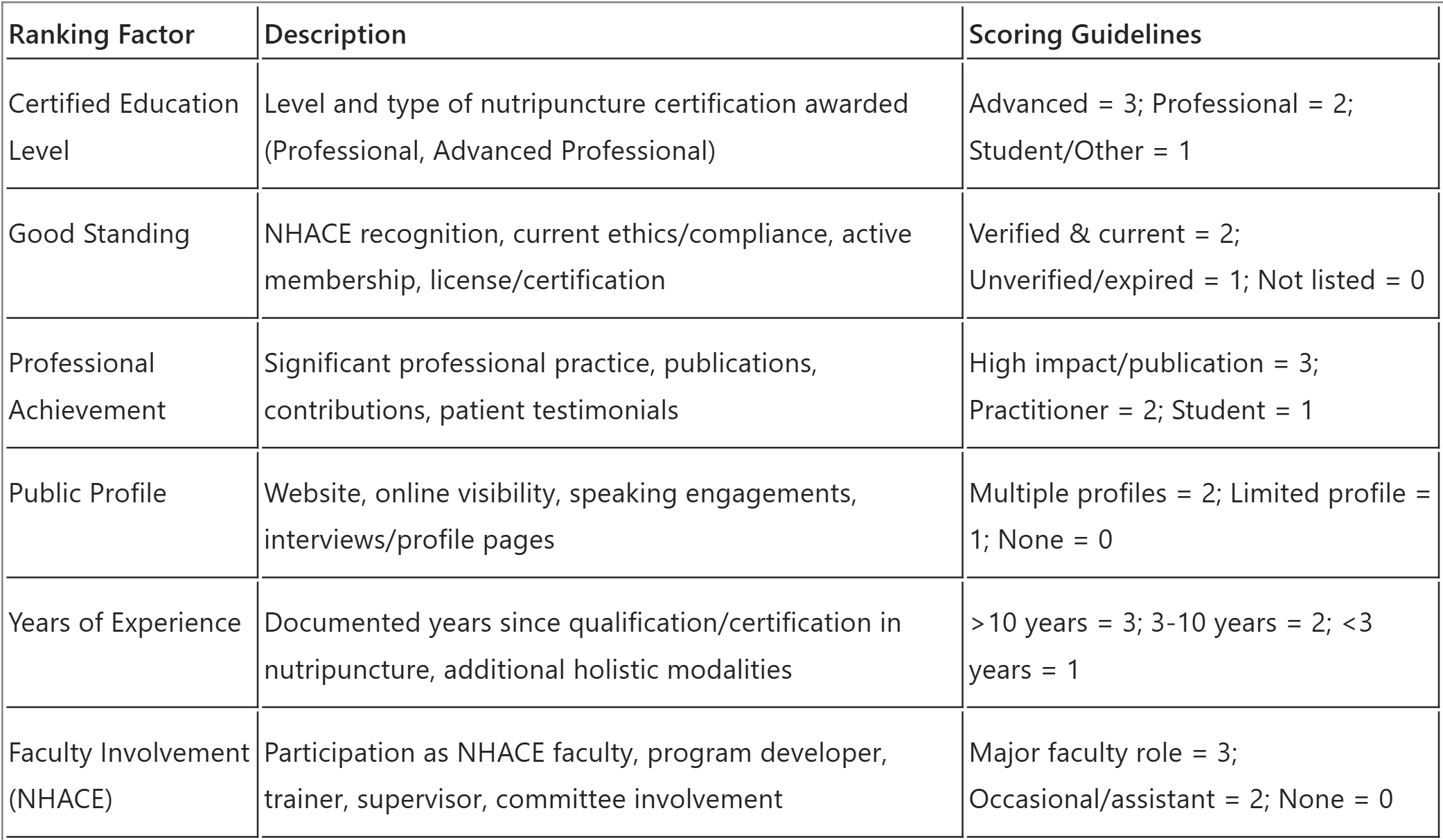 Nutripuncture sources. Each candidate should be scored according to these factors, with preference given to advanced certification, active faculty roles, and evidence of professional distinction and public engagement.